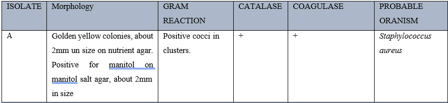Table 1 shows the identification of staphylococcus aureus isolated for the study. This was done using their cultural andbiochemical characteristics, macroscopically and microscopically. Culturalcharacteristics show that Staphylococcus aureus appeared golden yellow on nutrient agar plates and yellow on mannitol salt agar plates. It was also observed microscopically that it is gram positive and arranged in clusters. Biochemical test also showed that the isolateswere catalase and coagulase positive.