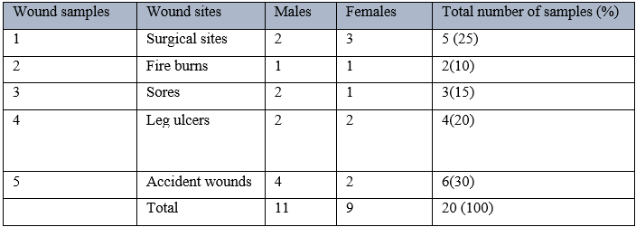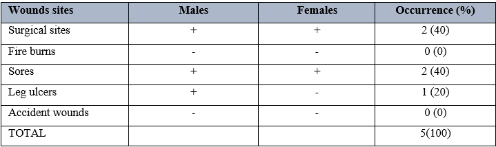 Table 2 shows the wound sites of people attending Rhema university teaching hospital according to gender. It was observed that most of the wound patients were males and people who had accident wounds were more (30%), followed by individuals with Leg Ulcers (20%) while wound cases from fire burns were the least (10%).