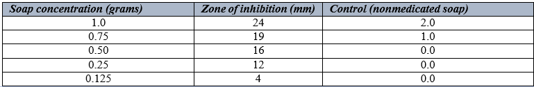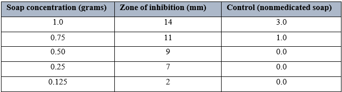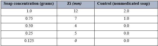 The antimicrobial activity was evaluated using the agar well diffusion method. Prior to use, of the test organisms were sub- cultured on nutrient broth and incubated at 37 degrees Centigrade for 24 hours. The concentration of the 24 hours culture was adjusted to 0.5 McFarland Standard. 0.1 ml volume of the standard suspension of each test bacterial strain was spread evenly on Muller Hinton agar plates using sterile L-shaped glass rod and the plates were allowed to dry at room temperature. Subsequently, 6 mm-diameter wells were bored on the agar and100 μl of each reconstituted soap solution was dispensed into triplicate wells. The plates were allowed to stand on flat surface at room temperature for 1 hour to allow proper diffusion of soap solution into the agar, the inoculated plates were then incubated at 37 o C for 24 h and the inhibition zone diameter (IZD) were measured in millimeters (mm). Antimicrobial activities were expressed as the IZD (mm) produced by the medicated soaps.