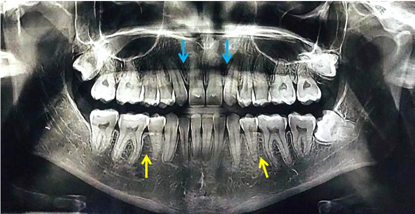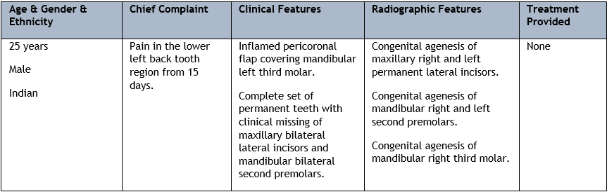 Literature search shows congenital agenesis of teeth occurring in a non-syndromic patient without any particular etiology which can be referred as an idiopathic nature. This clinical entity can involve any dentition either primary or permanent or any tooth [1]. The most commonly seen congenitally missing teeth are the third molars followed by maxillary lateral incisors and mandibular second premolars. There is no exact true etiology behind the occurrence of tooth agenesis; however, various genetic and environmental factors have been suggested as causative factors for tooth agenesis in humans [1]. The present article enlightens occurrence of bilateral idiopathic congenital dental agenesis involving maxillary lateral incisors and mandibular second premolars detected in an Indian patient following routine clinical and radiographic examination. Details of the present case are elaborated in Table 1 and Figure 1.
