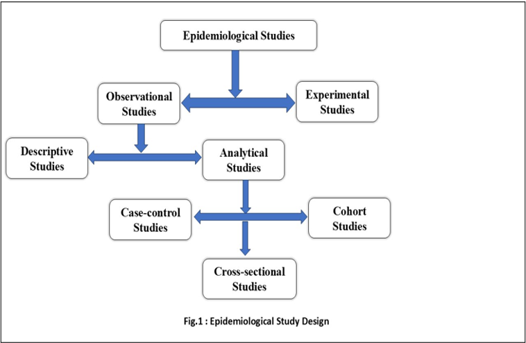 Observational studies can be of two types descriptive and analytical. In a descriptive study, the investigators observe the distribution of disease among individuals or populations. It describes the disease by time (when it occurs?), place (where it occurs?), and person (who is getting the disease?), distribution of the disease [3,5,6]. Here, the focus is to formulate a hypothesis. In comparison to descriptive studies, analytical studies go to a further step, that is they examine the relationship between disease occurrence and factors. Analytical studies test hypotheses about individuals in natural settings. Here the focus is on individuals within the population rather than the entire population. Analytical studies can be further classified into cross -sectional studies, case-control studies and cohort studies [6].