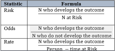 In a cohort study, odds, risks, and rates are used to estimate the frequency of a dichotomous outcome. These three are closely related, sharing the numerator – the number of persons who developed the outcome[24]. The formulas for calculating the odds, risks, and rates are given in the table.1