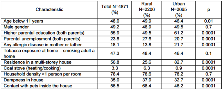 Methods: The data set of the study was collected using a questionnaire-based survey, containing the data of 4871 urban and rural children age 6 to 14 years. Correlation of asthma and allergic disease with familial and environmental factors was examined by means of multivariate logistic regression.