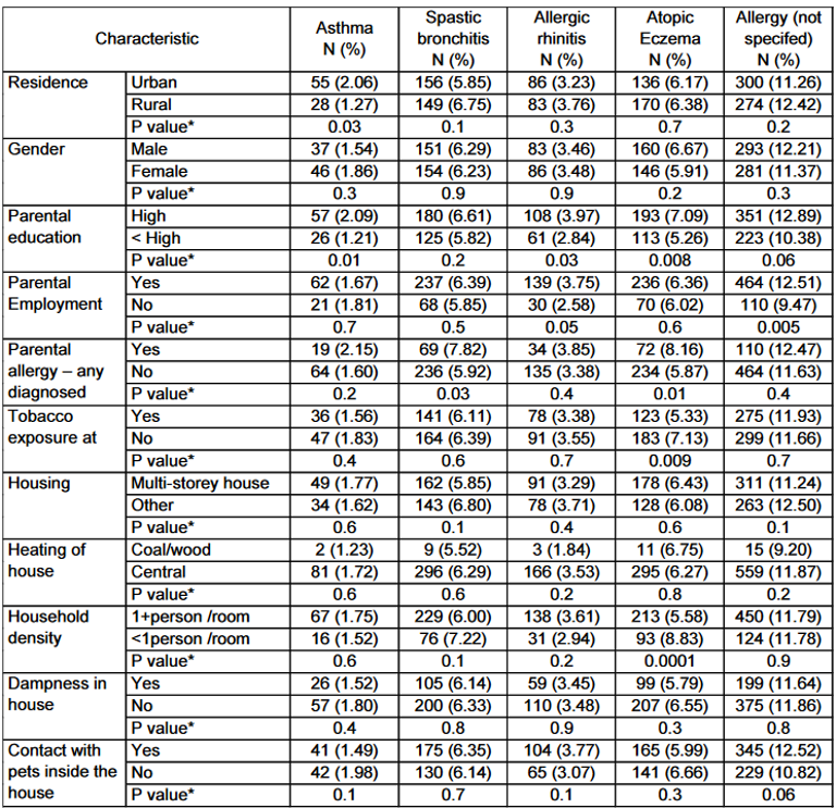 As results from logistic regression analysis, we found that an increased risk of asthma was associated with urban residence (p=0.04) and high parental education (p=0.02). Spastic bronchitis was associated with parental allergy (p=0.03). Atopic eczema had statistically significant associations with younger age (p=0.03), high parental education (p=0.03), parental allergy (p=0.02), tobacco smoke at home (p=0.02) and household crowding (p=0.0007). Diagnosis of unspecified sensitization was related to high parental education (p=0.03) and parental employment (p=0.02) (Table 3).