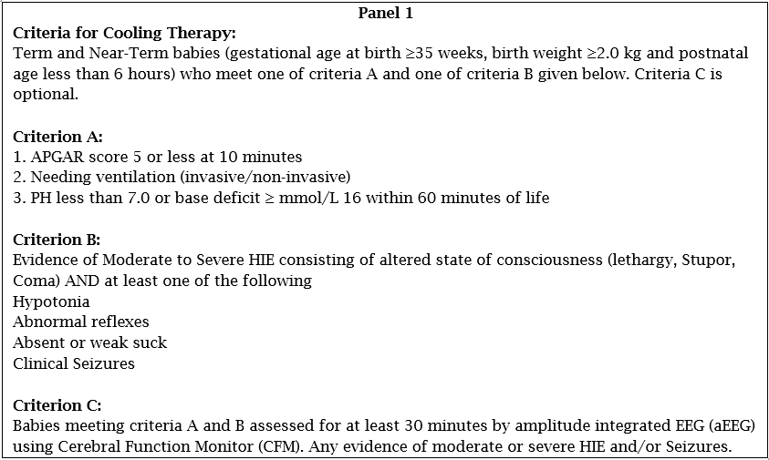 This is a retrospective cross-sectional cohort study conducted in newborn infants admitted to NICU of Dr Sulaiman Al Habib Hospital, Qassim from Jan 2020 to Dec 2023. The study and its data collection form were approved by the institutional review board (IRB). The inclusion criteria for the study included all babies who completed 72 hours of cooling followed by eight hours of gradual rewarming. The exclusion criteria included those babies who could not complete cooling & rewarming as per standard protocol. The criteria for cooling are given in Panel 1.