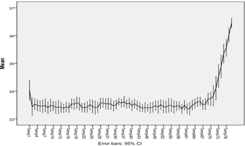 Mean temperature value was calculated for each 4 hours with standard deviation and plotted on the chart shown in Figure 1. All mean temperature values occurred between 33°C and 34°C