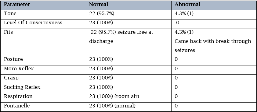 All 23 babies were discharged home alive. Neurological examination at discharge was done using Thompson score (Table 4). One baby had abnormal examination at discharge and one baby was readmitted due to breakthrough seizures. Twenty-one babies had normal examination.