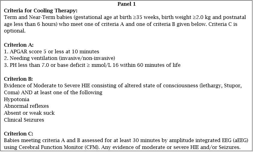 This is a retrospective cross-sectional cohort study conducted in newborn infants admitted to NICU of Dr Sulaiman Al Habib Hospital, Qassim from Jan 2020 to Dec 2023. The study and its data collection form were approved by the institutional review board (IRB). The inclusion criteria for the study included all babies who completed 72 hours of cooling followed by eight hours of gradual rewarming. The exclusion criteria included those babies who could not complete cooling & rewarming as per standard protocol. The criteria for cooling are given in Panel 1.