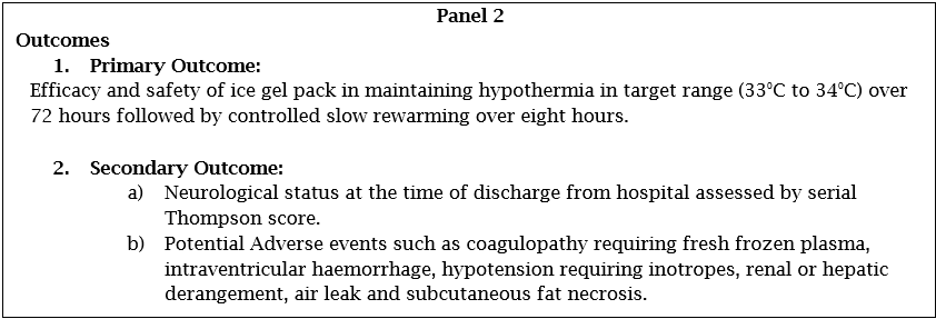 Demographic and clinical data including hourly rectal temperature records, lab investigations, neurological examination findings, ultrasound and MRI reports were retrieved from patient’s electronic medical records. Hourly rectal temperature records were plotted in graphic form for the trends in maintenance of TH during 72 hours of cooling and eight hours of rewarming within the protocol limits. Data was also analysed for associated risk factors of HIE, outcomes at discharge and on first follow up visit at one month. Post cooling MRI scans were used as a surrogate to predict outcomes. [11,12] MRI was performed on D 5 of life under General anaesthesia to minimize motion artifacts and was reported by neuroradiologist. The measured outcomes are given in Panel 2.
