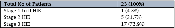 During study period 23 neonates were admitted to NICU with HIE and given cooling therapy. Initial scoring was done using Modified Sarnat & Sarnat score. Accordingly, babies were classified as having Stage I, II or III HIE. Five patients had Stage II HIE, 17 had stage III HIE and one had stage I to II HIE (Table 1).