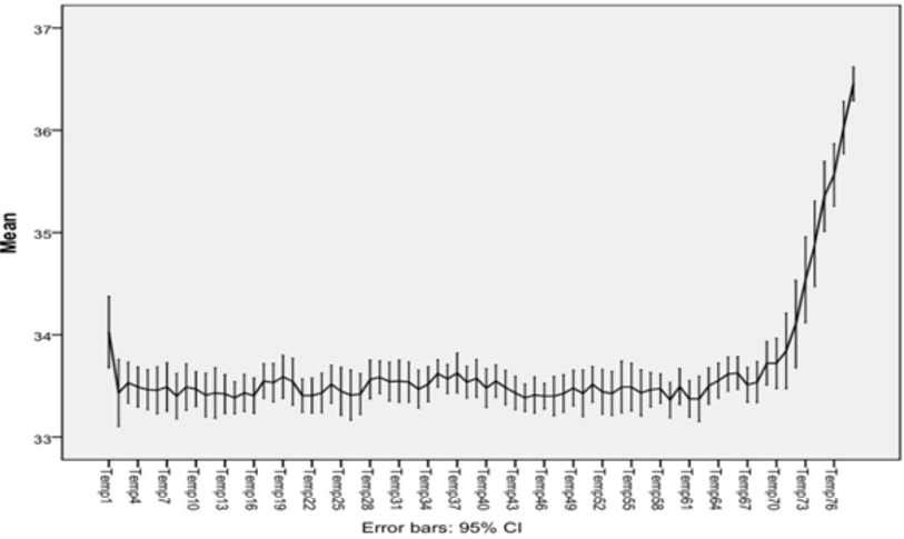 Mean temperature value was calculated for each 4 hours with standard deviation and plotted on the chart shown in Figure 1. All mean temperature values occurred between 33°C and 34°C