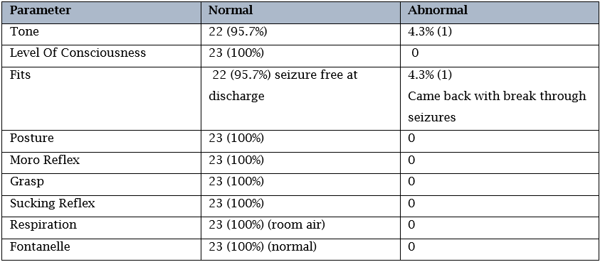 All 23 babies were discharged home alive. Neurological examination at discharge was done using Thompson score (Table 4). One baby had abnormal examination at discharge and one baby was readmitted due to breakthrough seizures. Twenty-one babies had normal examination.